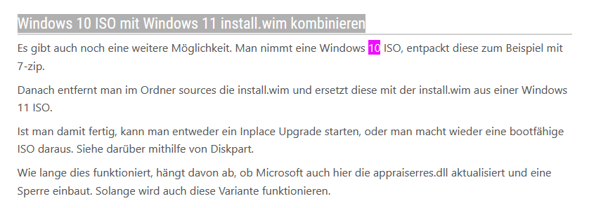 Neulich altes Samsung Notebook neu aufgesetzt mit Win10 22H2, wg. ssd Wechsel. Plötzlich wurde kein Massenspeicher gefunden, obwohl win10 zuvor drauf war. Angeblich fehlender Treiber. Also Win10 1902 genommen, das ging. Dann upgegradet auf 22H2.