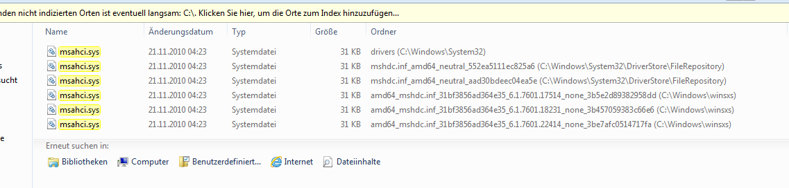Es war aber nur eine Festplatte drin zum Zeitpunkt der installation. Jetzt ist Win7 drauf und alles läuft soweit. Nur wollte ich das System jetzt auf den AHCI Modus umstellen. Dazu soll man in der Registry einen bestimmten Wert auf 0 setzten und dann runterfahren und im Bios auf AHCI wechseln. Das sollte reichen sagt man. Das tut aber nicht bei mir. Wenn ich den PC danach wieder einschalte dann kommt der MS Reparaturversuch der aber nicht funktioniert und ledeglich am ende vorschlägt das system auf einen vorherigen Stand zurück zu sichern. Das möchte ich aber nicht.