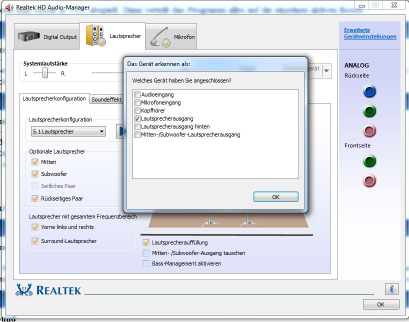 Ich hab schon alles versucht, von Stecker umstecken bis zum Soundmanager auf 5.1+ umzustellen es bringt einfach nichts. Und unter Sound > Konfigurieren des Soundausgangs hab ich auch schon auf 5.1 etc. umgeschaltet.