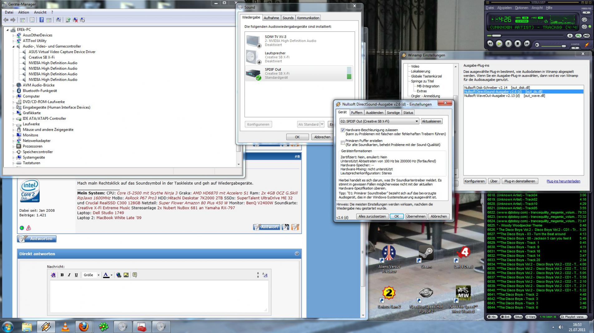 Das Treiberwirwar von Creativ habe ich einmal Deinstaliert, neu runtergeladen und wieder instaliert. Mit gefühlten 1000 PC-Neustarts aber Ton habe ich noch immer keinen.... nicht mit Winamp, nicht mit VLC auch nicht via WMPlayer... nix.