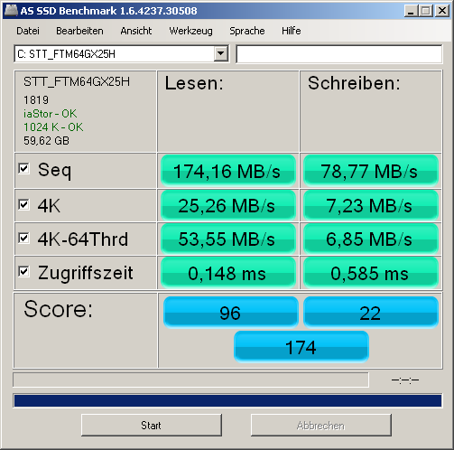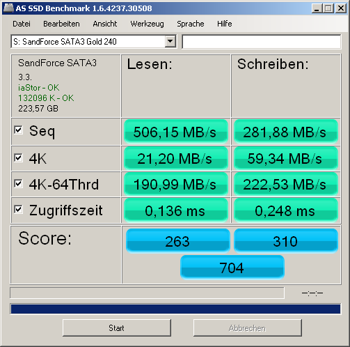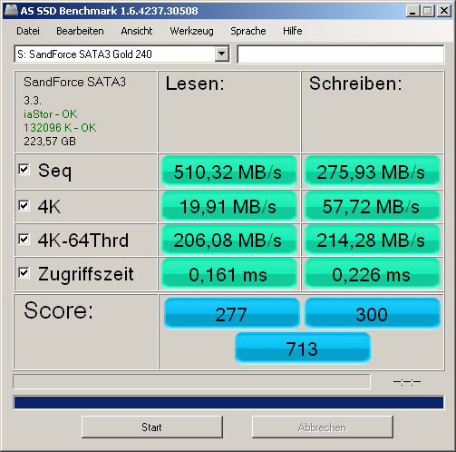 Dann hast Du kein TRIM und eben auch keine gute Performance der SSD, wie man sieht. Obwohl, das mit dem TRIM könnten wir demnächst mal testen, wenn Du willst.