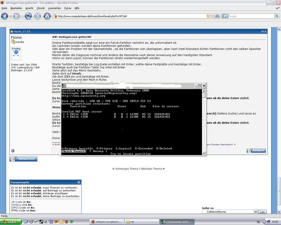 Habe über die Wiederherstellungskonsole, Systemwiederherstellung und Windowsreparatur eine Korrektur des Fehlers versucht (alles mit der Windowsinstallations CD), doch auch da komme ich nicht weiter, da die Systemwiederherstellung nicht anspringt, die Wiederherstellungskonsole sagt ich hätte mindestens einen nicht behebaren Fehler und die Windowsreparatur sagt ich hätte gar kein Windows drauf!