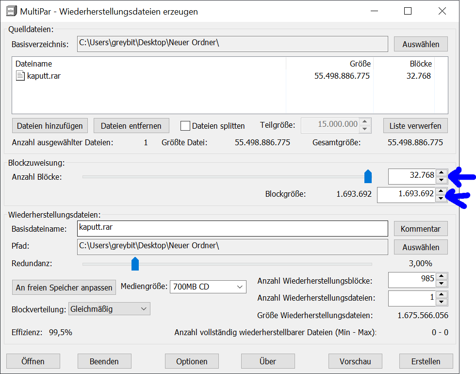 Aber vorab für alle die nicht wissen wie Widerherstellungsdaten funktionieren eine kleine Erklärung. Wenn eine Datei beschädigt wird kann diese mit Widerherstellungsdaten repariert werden. Dabei wird die Datei in gleich große Blöcke aufgeteilt. Nehmen wir z.B. eine 100MB Datei, könnten wir diese in 100 * 1MB Blöcke aufteilen. Wenn es jetzt zu einer Beschädigung in einem Block kommt, können wir diesen mit Widerherstellungsdaten reparieren, sofern wir vor der Beschädigung welche angelegt hatten. Wenn wir für die Datei 5% Wiederherstellungsdaten angelegt hatten, entspräche das 5 x 1MB die repariert werden könnten unabhängig davon wo die Fehler in der Datei aufgetreten sind.