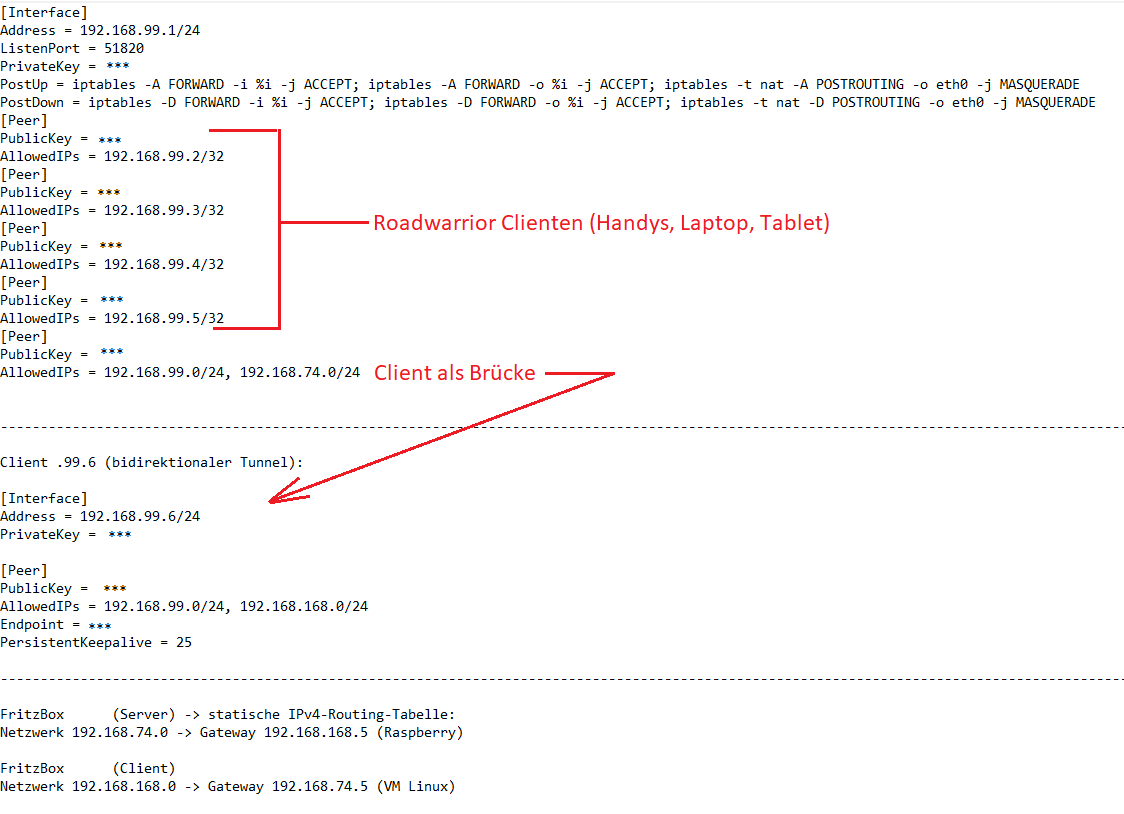 Die Konfiguration erhält in der Form oben den privaten Adressbereich 172.16.100.0 welcher dann das Netz des VPN wird. Auszufüllen sind nun noch die entsprechenden Felder mit den Private- und PublicKeys.