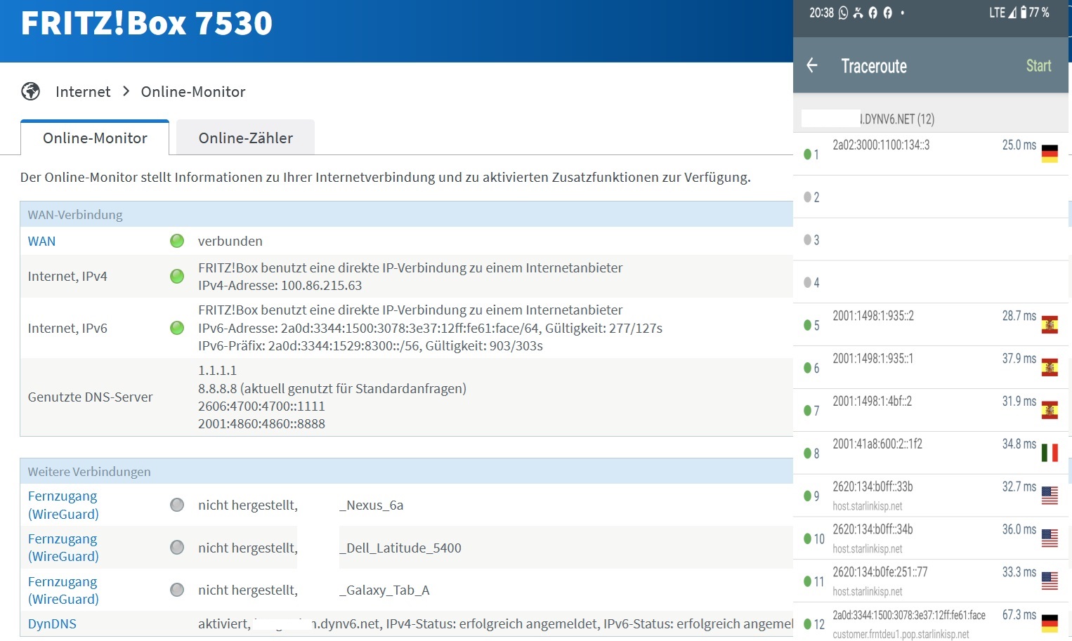 Der Internetzugang geht per IPv6 über Starlink, dessen Router im Bypss-Modus ist an Port 1 der Fritzbox.
