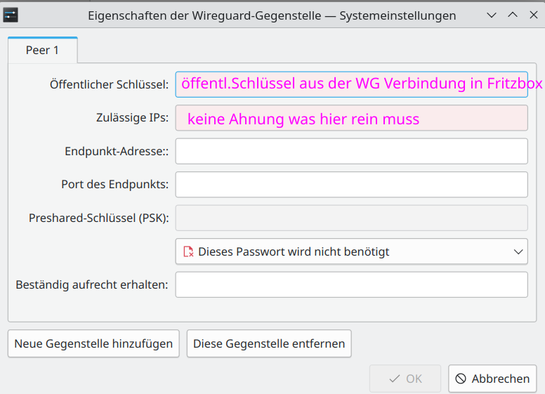 Ich muss doch irgendwie den öffentlichen Schlüssel aus der Fritzbox in die WG Verbindung vom PC integrieren und die FB als Ausgangspunkt zum Internet festlegen.