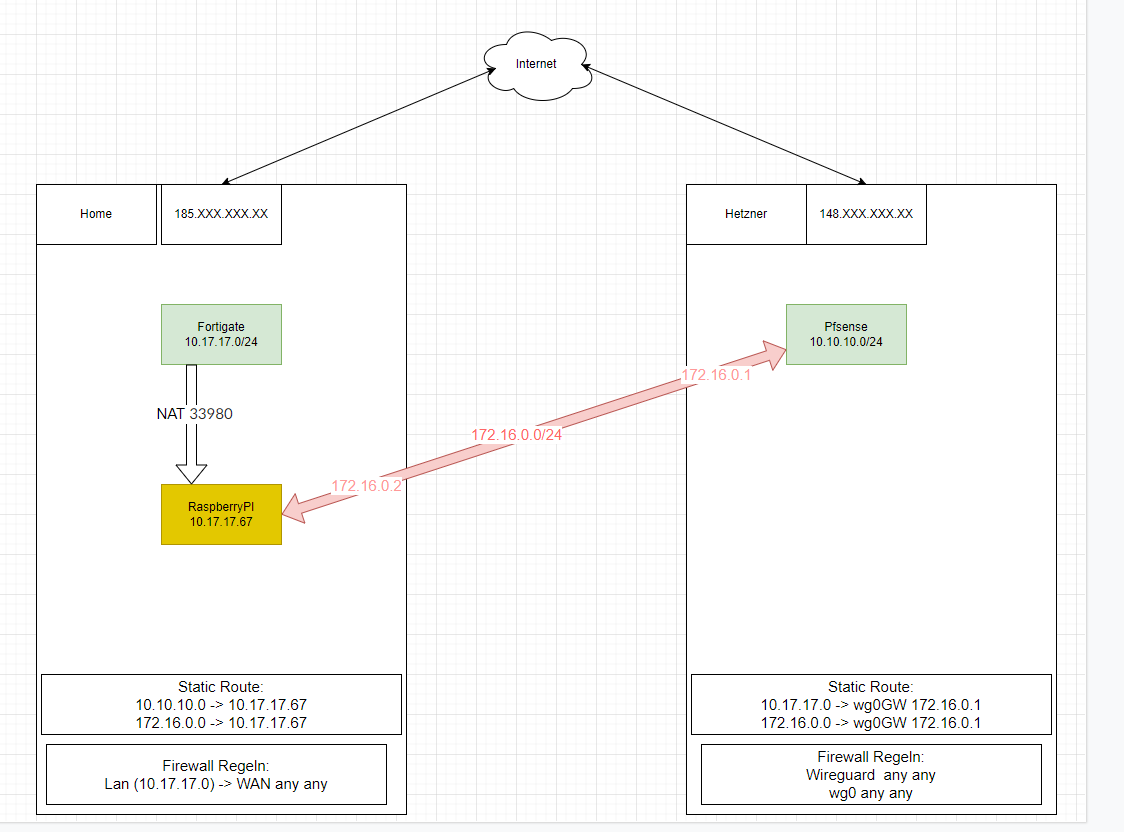 Ich nutze aktuell noch eine Fortigate Firewall zu Hause und möchte eine Wireguard s2s Verbindung mit meinem Proxmox Server aufbauen, worauf eine pfsense installiert ist. Da die Fortigate kein Wireguard unterstützt, habe ich einen Raspberry pi mit Wireguard installiert und leite den Wireguard Port mit NAT an den Raspbi weiter.
