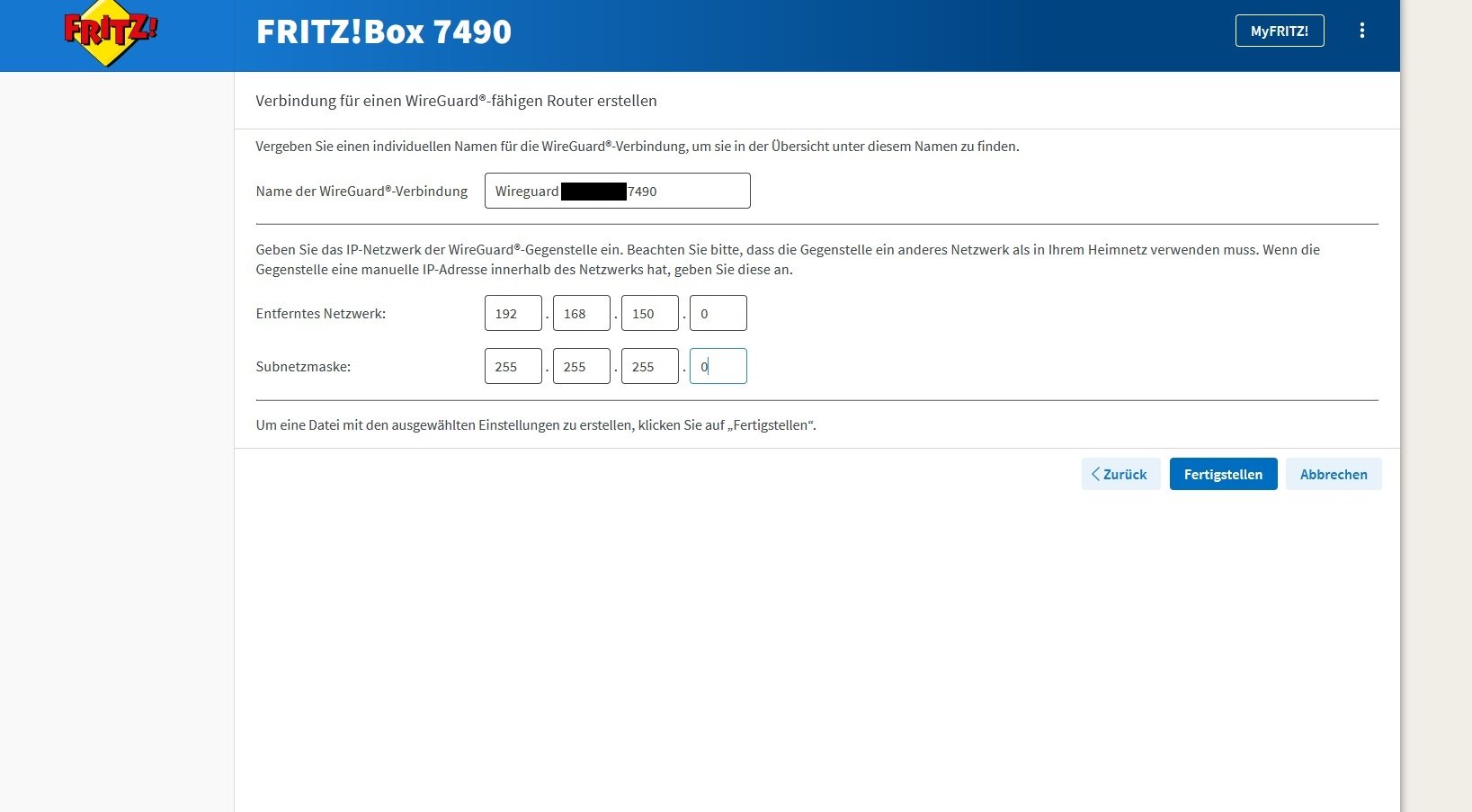 Ich komme nicht wirklich weit. Zur Zeit bin ich auf Anlage 2 und versuche in der Fritzbox die Wireguard Verbindung auf die Fritzbox 7590 / 192.168.150.1 einzurichten. Da kommt aber dieser Fehler: Auch beim erneuten versuchen.