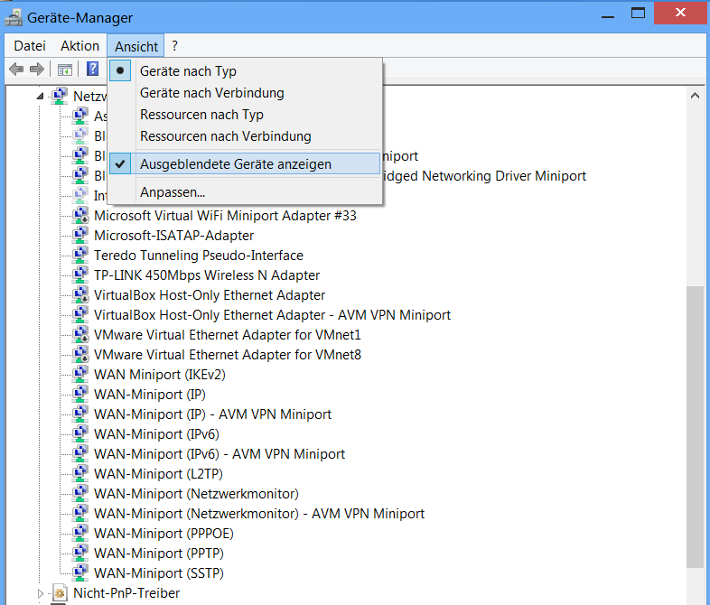 Ich hab es schon im Gerätemanager über Ansicht => Ausgeblendete Geräte anzeigen versucht.