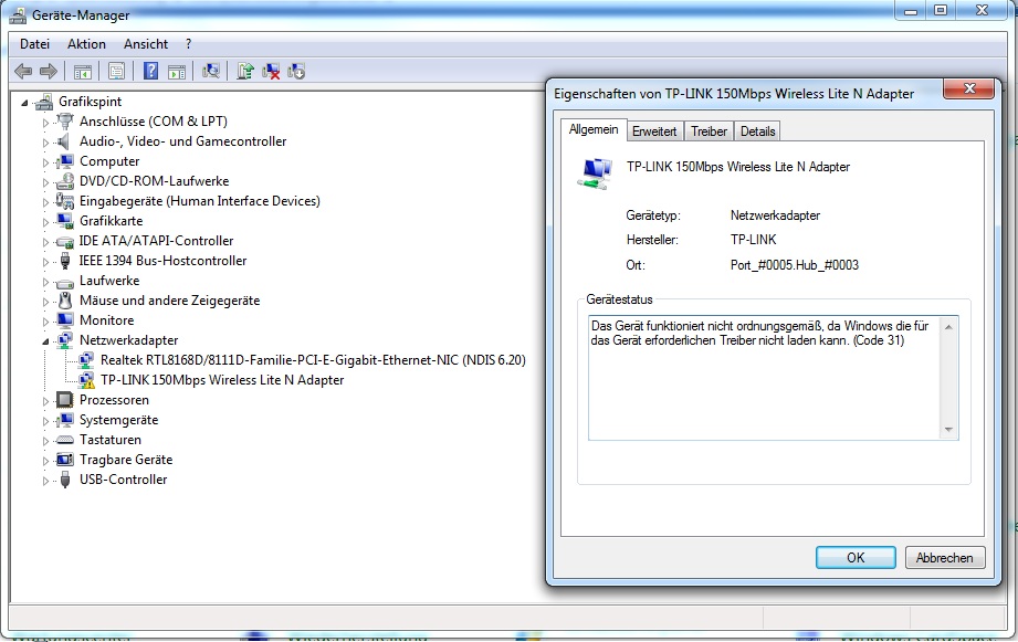 Und in Geräte Manager steht, dass der Treiber nicht geladen werden kann.