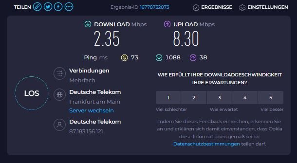 wie schon im Betreff erwähnt ist mein Download Speed am PC seit geraumer Zeit super lahm. Der Speedtest sagt 0,88 Mbit/s. Am gleichen Ort wenn ich das Handy mit einem Speedtest laufen lasse hab ich beim Download aber 20 Mbit/s