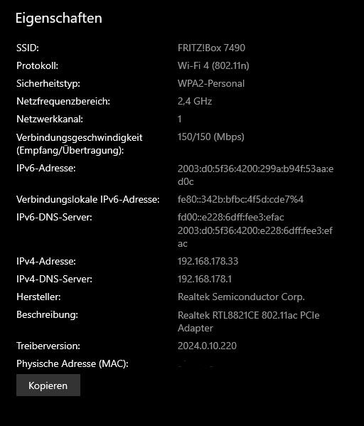 Scroll in diesem Fenster ganz nach unten und mache davon einen Screenshot (oder nutze die "Kopieren" Schaltfläche um die Eigenschaften des WLANS dann hierher zu kopieren) - das sind die Eigenschaften des verbundenen WLANs.