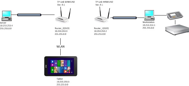 Dazu habe ich allen Geräten im Netzwerk erst einmal statische Adressen vergeben. Der Adressbereich ist mir vorgegeben, da der eine Laptop nicht frei konfigurierbar ist.