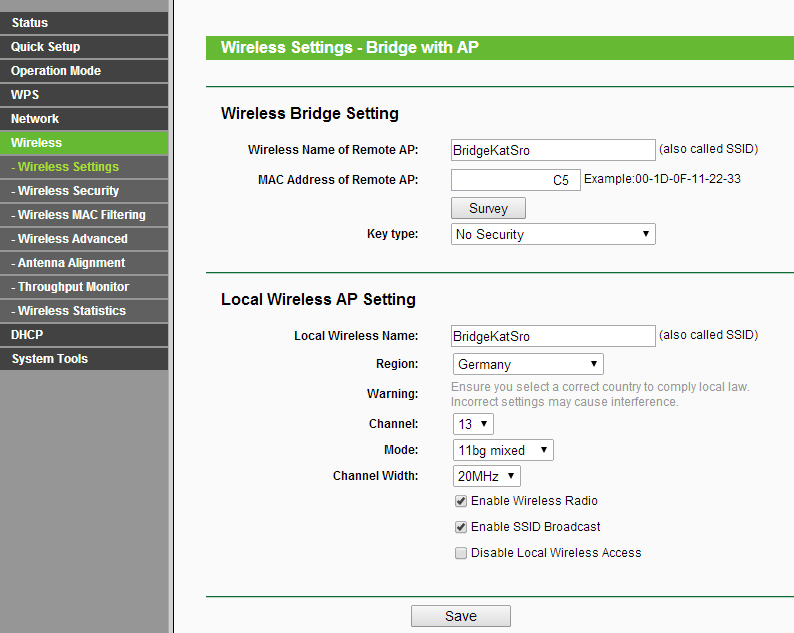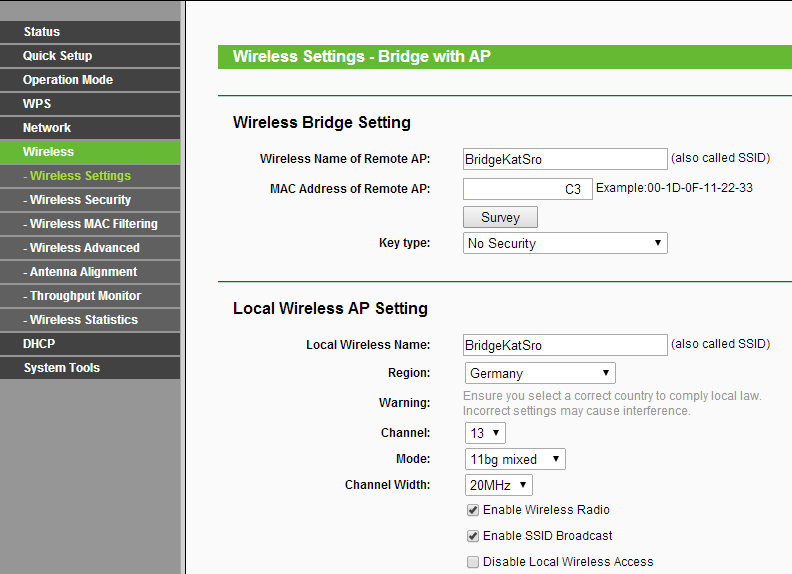 WLAN Security ist erstmal für den Test aus, SSID Boardcast an.
