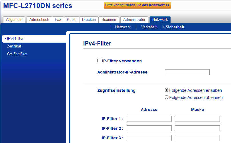 Gibt es eine Möglichkeit, den Drucker in dieser Situation nur für die beiden Rechner zur Verfügung zu stellen? Ich habe im Web-Interface des Druckers nachgesehen, da scheint es jedoch keine Option speziell dafür zu geben. Auch sonst fällt mir spontan keine weitere Möglichkeit ein. Was kann man tun, ohne den Drucker doch wieder per USB mit einem Rechner zu verbinden? (Dann müsste wieder ein Schreibtisch freigeräumt werden oder ein USB-Kabel durch den halben Raum gelegt werden, was beides nicht so toll wäre, außerdem sollte der Drucker auch bestenfalls verfügbar sein, wenn ein Rechner aus ist.)