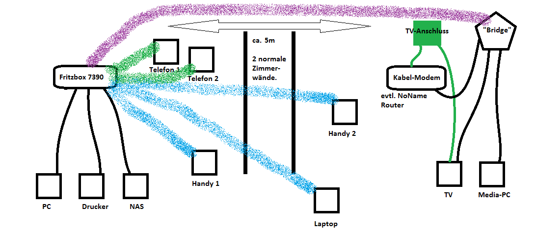 2. Kann ich die wLAN-Bridge (über die ja erstmal das Internet zur zentralen Verteilung der Fritzbox geht, mit den Daten "mixen" die von der Fritzbox zum Media-PC sollen?