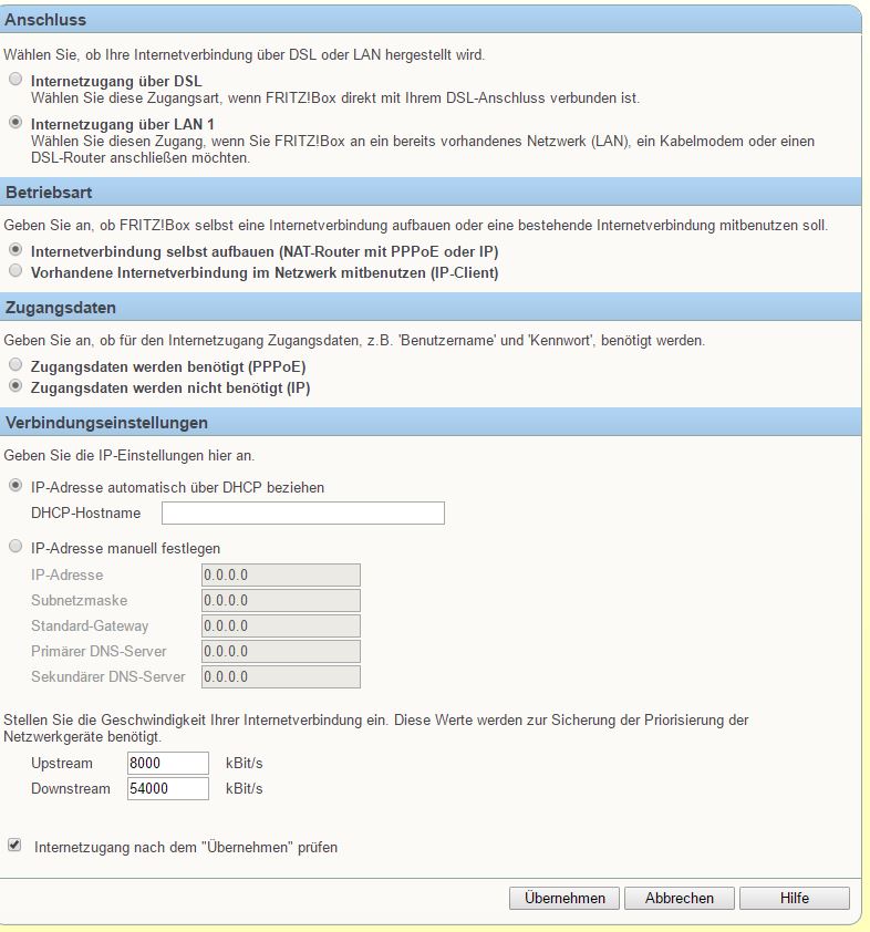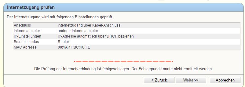 Klicke ich auf Zugangsart ändern und gehe durch das Menü kommt am Ende "Die Prüfung der Internetverbindung ist fehlgeschlagen."