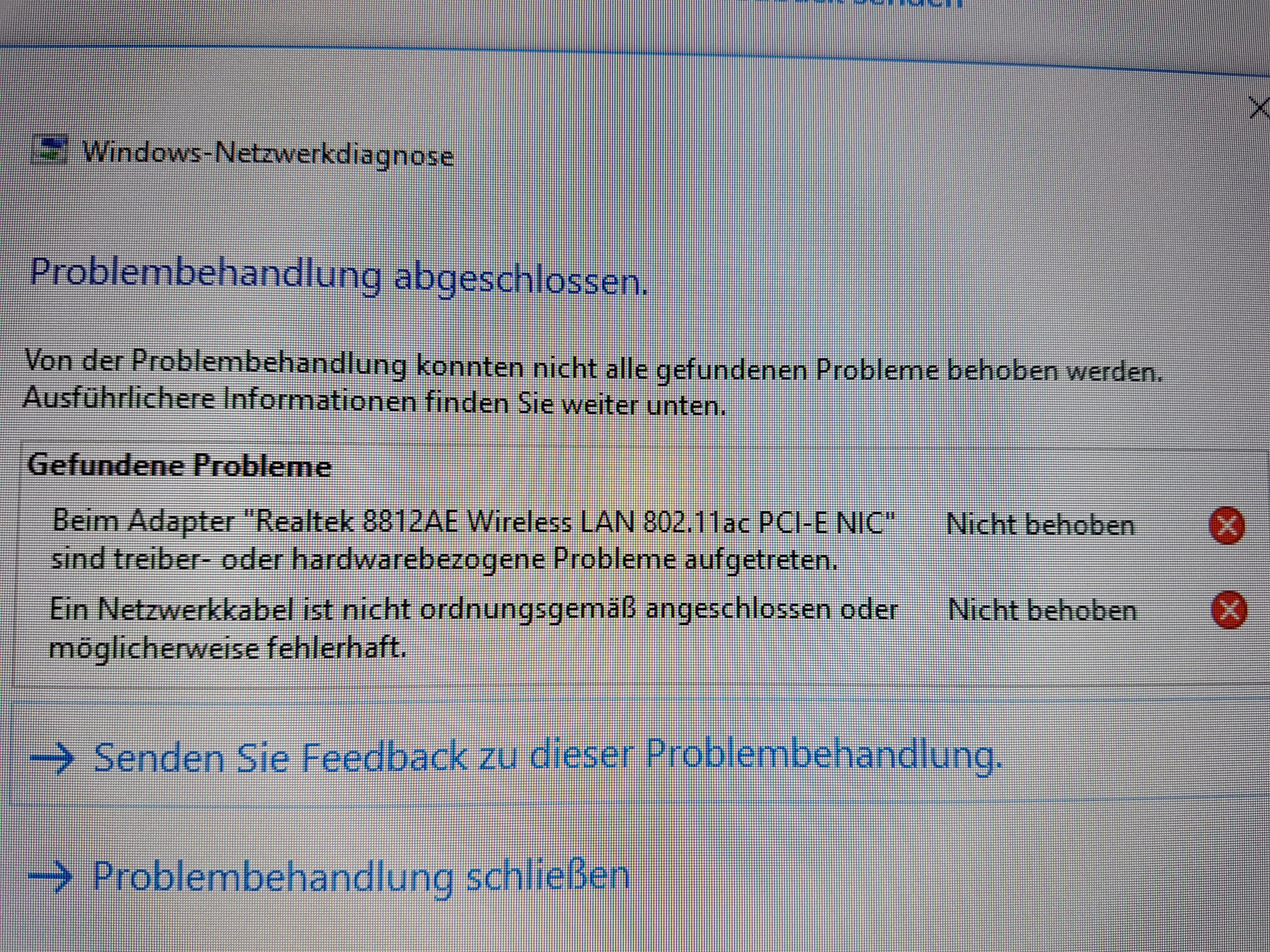 Doch nichts funktioniert. De Pc zeigt mir an "Ethernet kabel ist nicht richtig angeschlossen" oder auch "Beim Adapter Realtek 8812AE Wireless LAN.." sind hardwarebezogene Probleme aufgetretten.