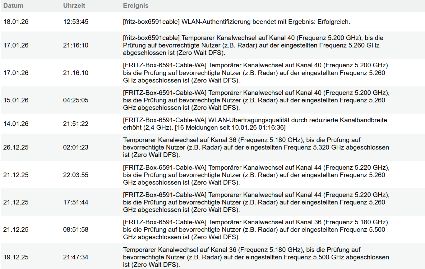 - Testweise habe ich die FB6591 getauscht und einen Unifi U7 Lite reingehängt (hängt normalerweise in der Garage als AP für die Wallbox) - es hat sich allerdings nichts geändert, ansonsten hätte ich die alte Fritz!Box sofort rausgeworfen.
