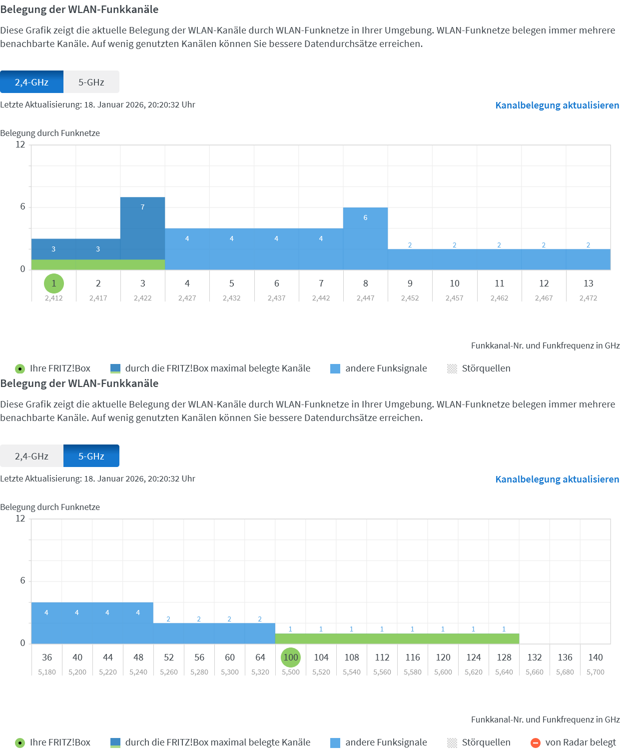 Wir sind von einem Zwei- in ein Sechsfamilienhaus gezogen - hier ist WLAN-technisch natürlich etwas mehr los. Kann es sein, dass alle Probleme auf störende WLANs zurückzuführen sind? Ich war bisher nur in Ein- oder Zweifamilienhäusern zuhause. Einmal in einem Haus mit 8 Wohnungen, wobei nur 2 Wohnungen pro Etage und viel massive Materialien (Beton, KS-Wände), da wurden die anderen WLAN ordentlich gedämpft.