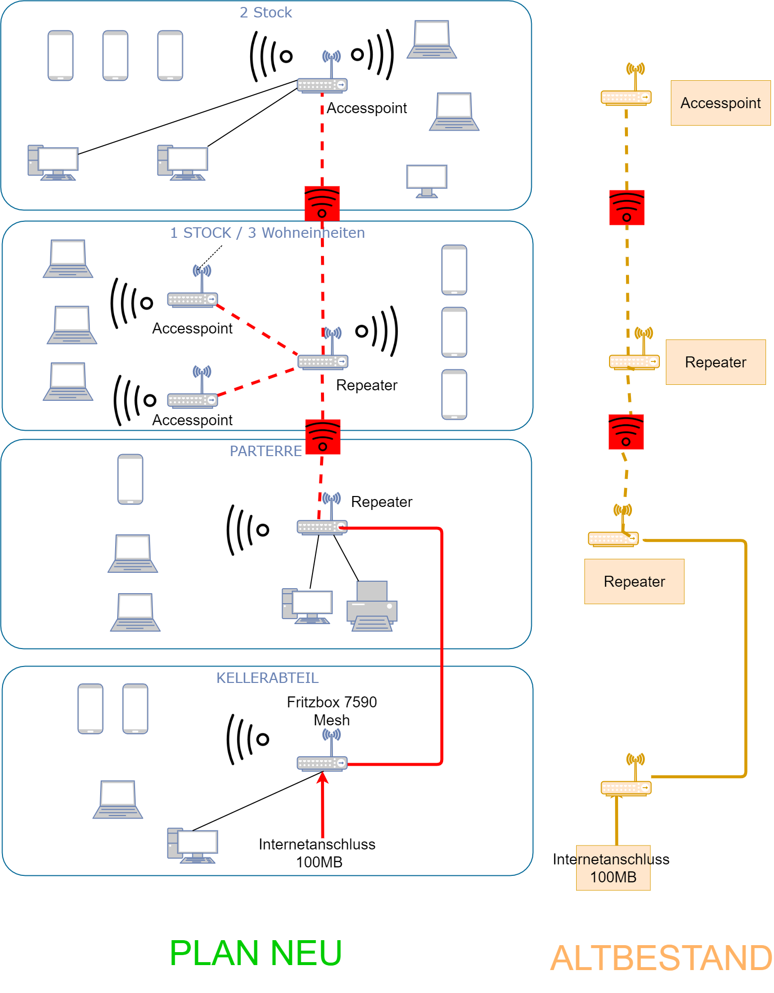 Aktuell läuft auch schon ein WLAN Netzwerk (Router im Keller, Xiaomi Router/Repeater im Parterre sowie im 1+2 OG) - jedoch im 2 OG bleibt von dem ursprünglich 100MB Internetgeschwindigkeit nicht mehr viel übrig :-( beziehungsweise bricht das WLAN sehr oft ab.