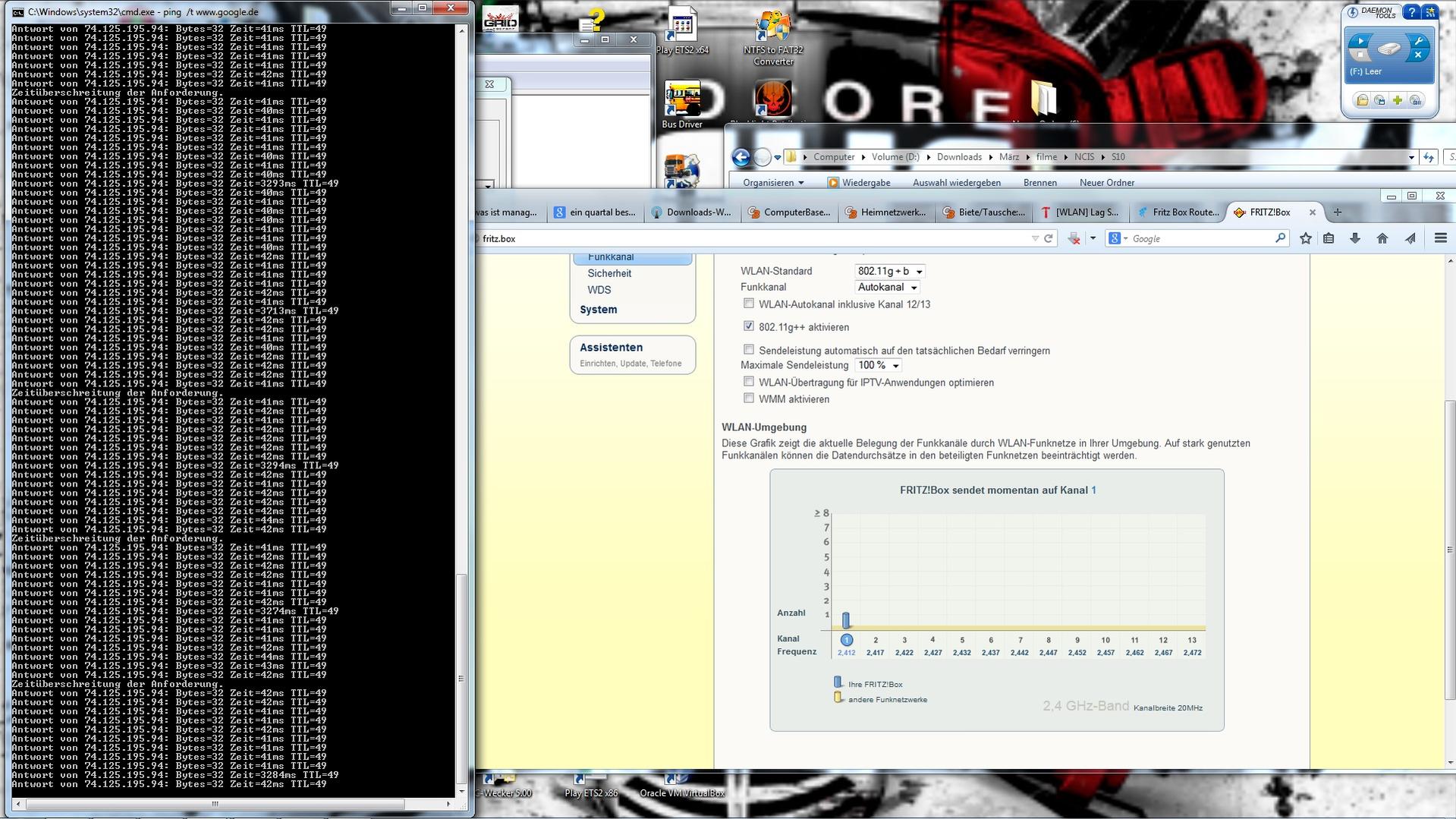 Da ich zu meiner Freundin gezogen bin brauchte mein Rechner WLAN soweit kein problem WLAN stick AC430 und Repeater gekauft alles fertig gemacht und fertig. Die ersten Tage ging auch alles recht gut bis dann auf Heute. Ich habe wohl bemerkt heute noch den ganzen Tag GTA 5 Online gezockt mich mega mässig über die 14 jährigen kinder aufgeregt usw. es lief alles gut keine PSN abbrücke garnix. Nun wollte ich ebend was am PC zocken gehen gehe online und habe nur LAG badam. Ich schleich mich bei uns ins TS und sehe da das ich ein 1024 - 3200 ping habe. Habe per CMD ( ping /t www.google.de ) angepingt und habe immer wieder zwischen drin 3000ms manschmal auch zeitüberschreitung. woran kann dies liegen ?