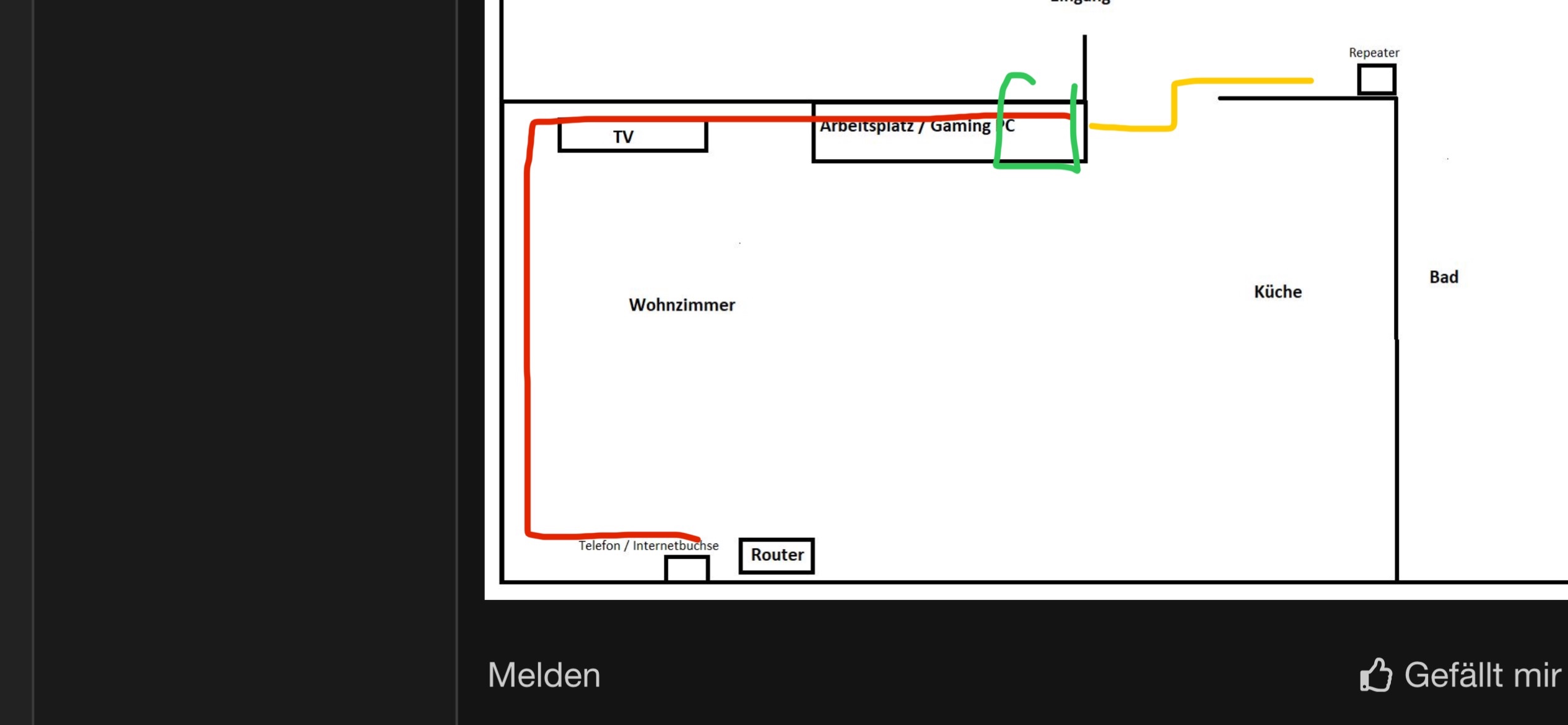 Als der Telekom-Techniker zur Einrichtung des Anschlusses in die Wohnung kam, hatte er mich schon darauf hingewiesen, dass die Telefon / Internetbuchsen in der Wohnung parallel geschaltet seien und, dass das unter Umständen zu Leistungseinbrüchen bzw Instabilität führen könnte. Die Zweigstelle haben wir aber nicht gefunden. Da die WLAN-Reichweite nicht bis in den hinteren Teil der Wohnung (Bad und Schlafzimmer) ausreicht, habe ich den besagten WLAN-Repeater ans hintere Ende des Flures (siehe Skizze) platziert.