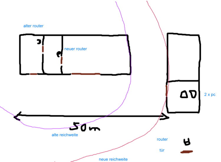 Stell den neuen Router in der Nähe deiner PCs auf und versuche beide per WDS zu verbinden. Das müssen natürlich beide unterstützen.