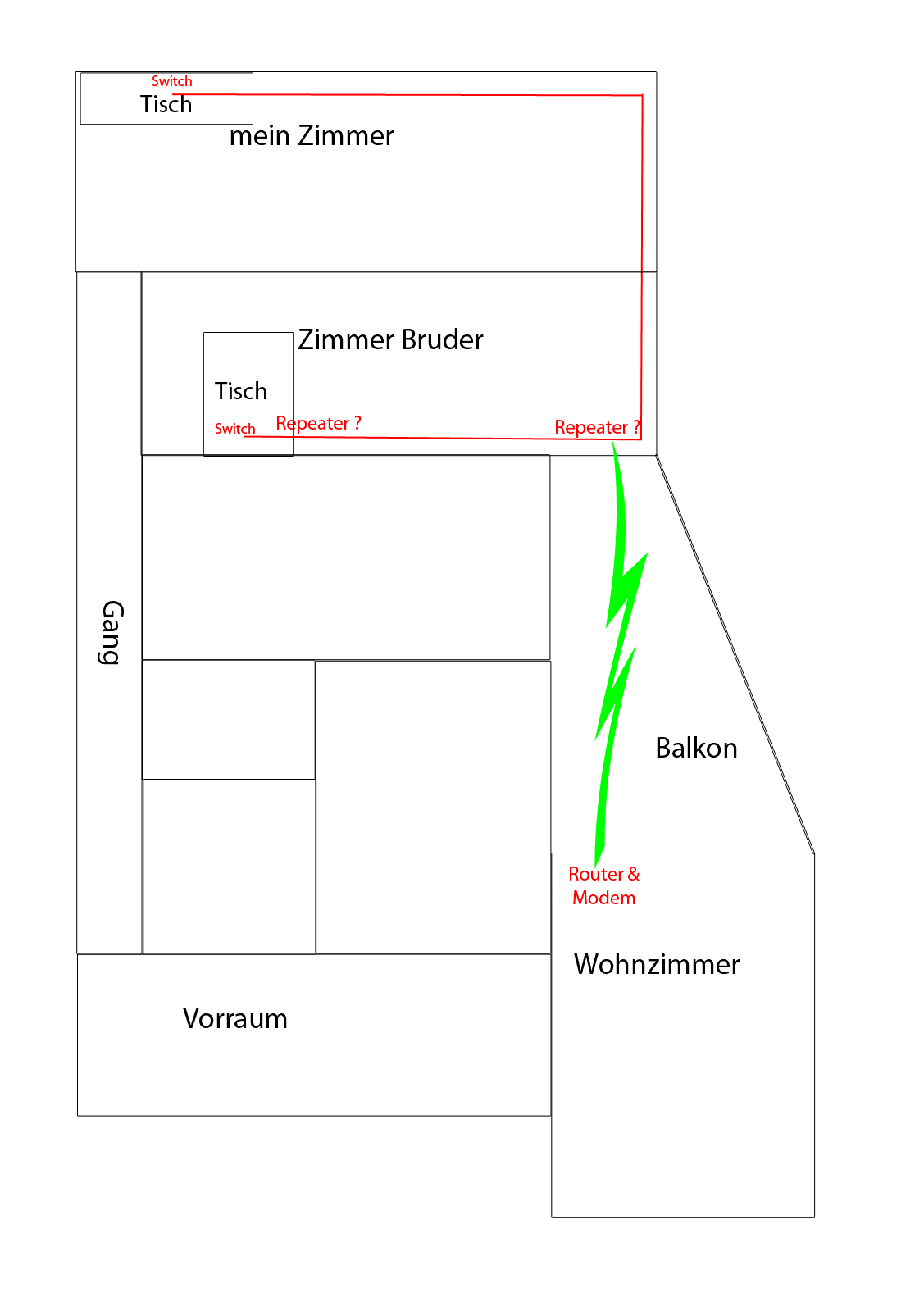 Deswegen wollte ich vom Wohnzimmer, wo das Modem und der Router hinkommt, zum Zimmer meines Bruders eine WLan Brücke bauen. (siehe Anhang)