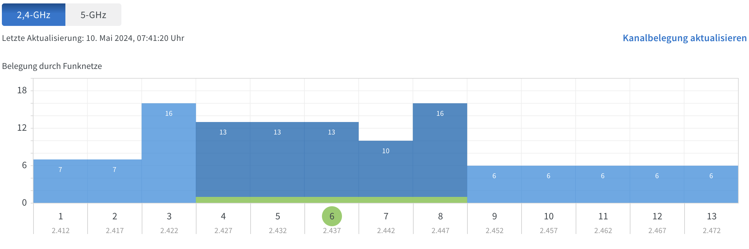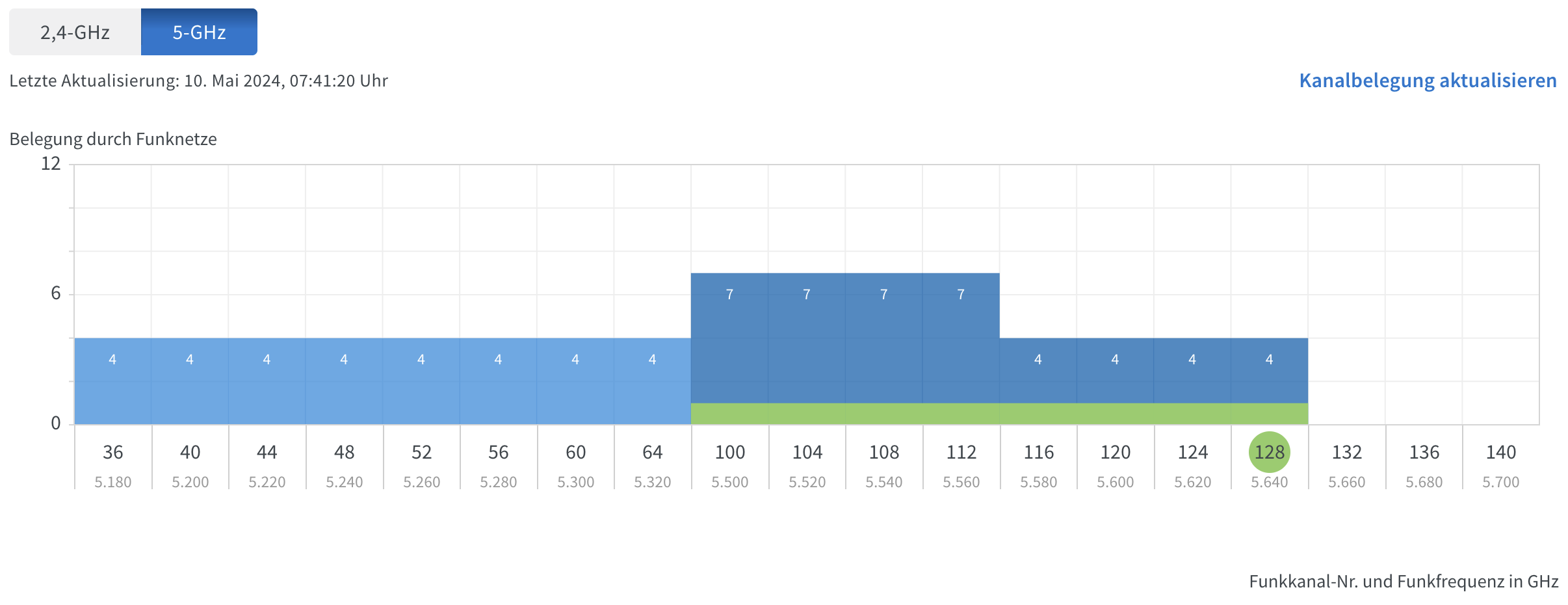 - Kanalwahl: 2.4GHz: 6; 5GHz: 128
