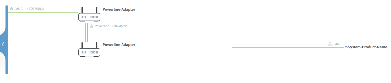 Das ganze läuft über PowerlineAdapter. Anbei findet ihr das Mesh Netz. Ich frage mich woran das liegt, denn er zeigt an, dass über PowerLine gute 90 Mbit durchgehen. Die Kabel sind auch neu.
