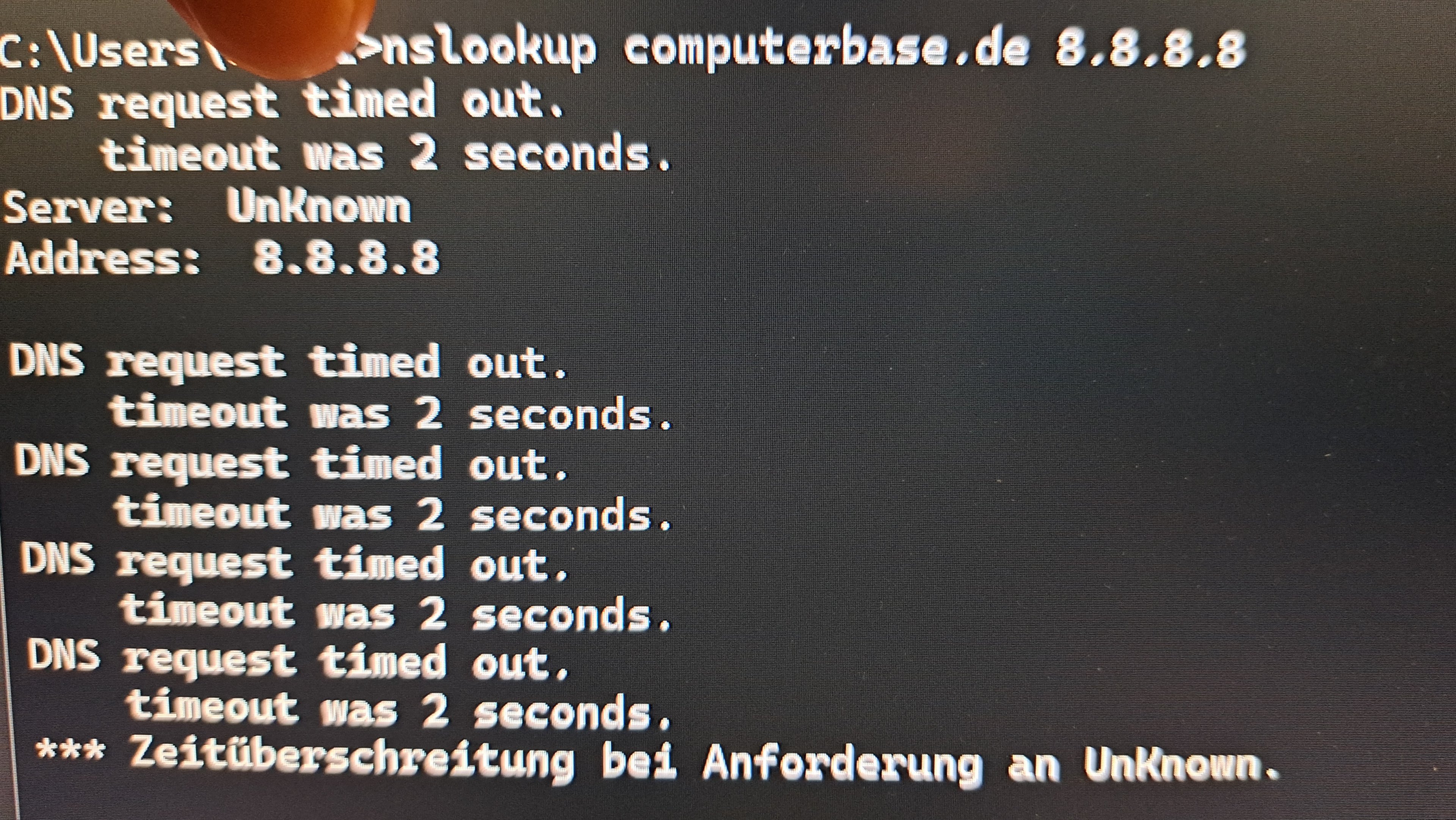 nslookup computerbase.de 8.8.8.8 wird hingegen explizit 8.8.8.8, also der google-dns gefragt. Mit diesem Test kann man abgrenzen ob es ein generelles DNS-Problem ist oder ob ggfs nur die Fritzbox Probleme mit DNS hat. Daher bitte nslookup mit 8.8.8.8 nachliefern.