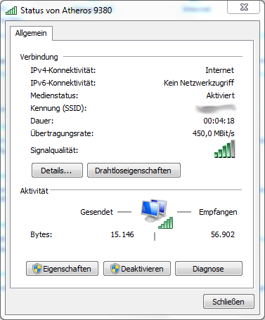 Wie du auf dem Bild sehen kannst ist bei mir auch WMM am Router kurz abgeschaltet und er verbindet sich mit 450 Mbit obwohl mein Router nur 300 kann