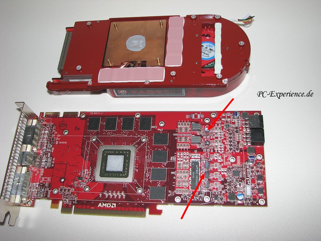 Ich habe dazu einen Artikel gefunden auf dem ein Bild dabei war, wo die Spannungswandler markiert waren. Nun sieht meine Karte von innen ganz anders aus und ich frage mich, wurden die Spannungswandler seitens PowerColor bereits berücksichtigt und werden die besser gekühlt?? Weiter würde mich interessieren, wo die sich auf meiner Karte überhapt befinden. Zwar gibt es zu eben jener Karte einen ausführlichen Test hier bei Computerbase, doch wurde diese nicht aufgeschraubt bzw von innen betrachtet.