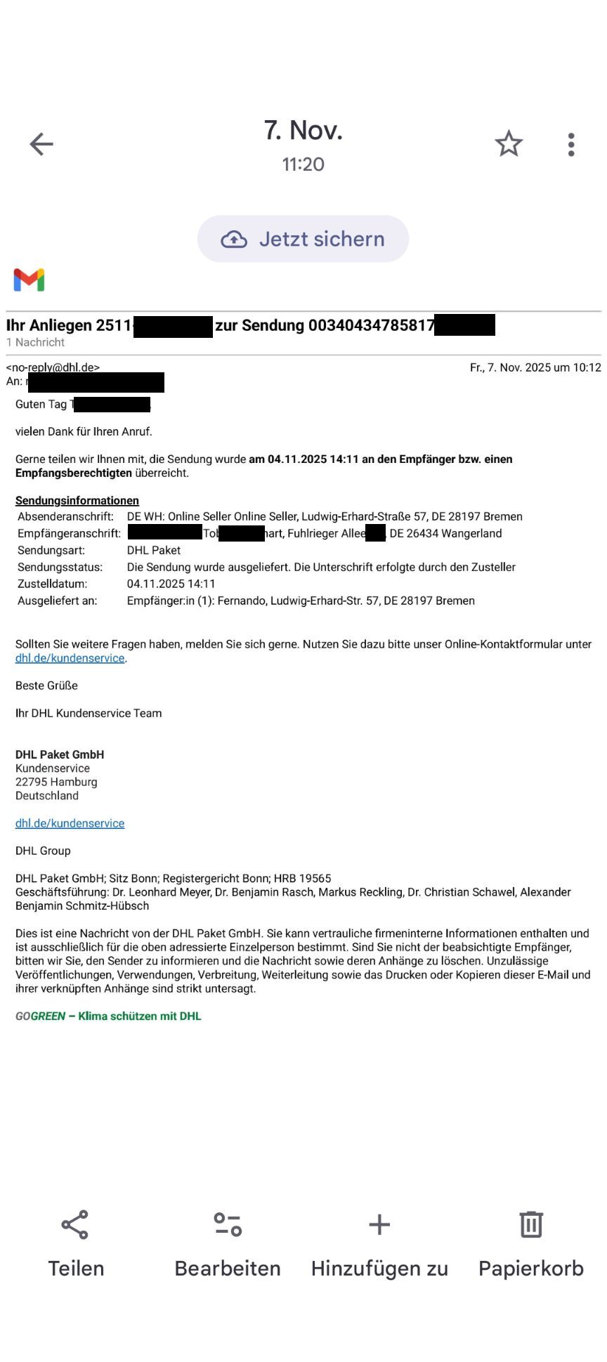- Ich wurde am 07.11.2025 durch DHL zurückgerufen. Nach dem Telefonat habe ich eine detaillierte Sendungsverfolgung per Mail erhalten in der ersichtlich ist, dass Absender und Empfänger identisch sind. (Anlage 3) Die Dame fragte mich am Ende des Gesprächs, ob ich eine Nachforschung beauftragen möchte. Ich verneinte dies, weil ich gedacht habe, dass die Bestätigung per Mail als Nachweis ausreichen würde.