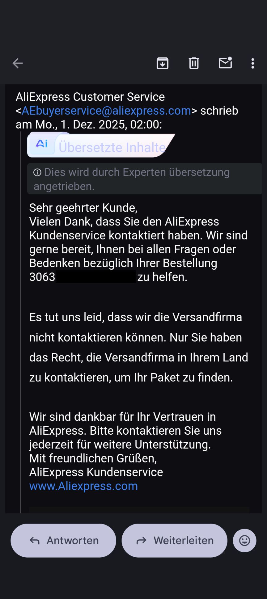 - 04.11.2025 Da das Paket nicht an mich ging wurde Aliexpress um Rückerstattung gebeten