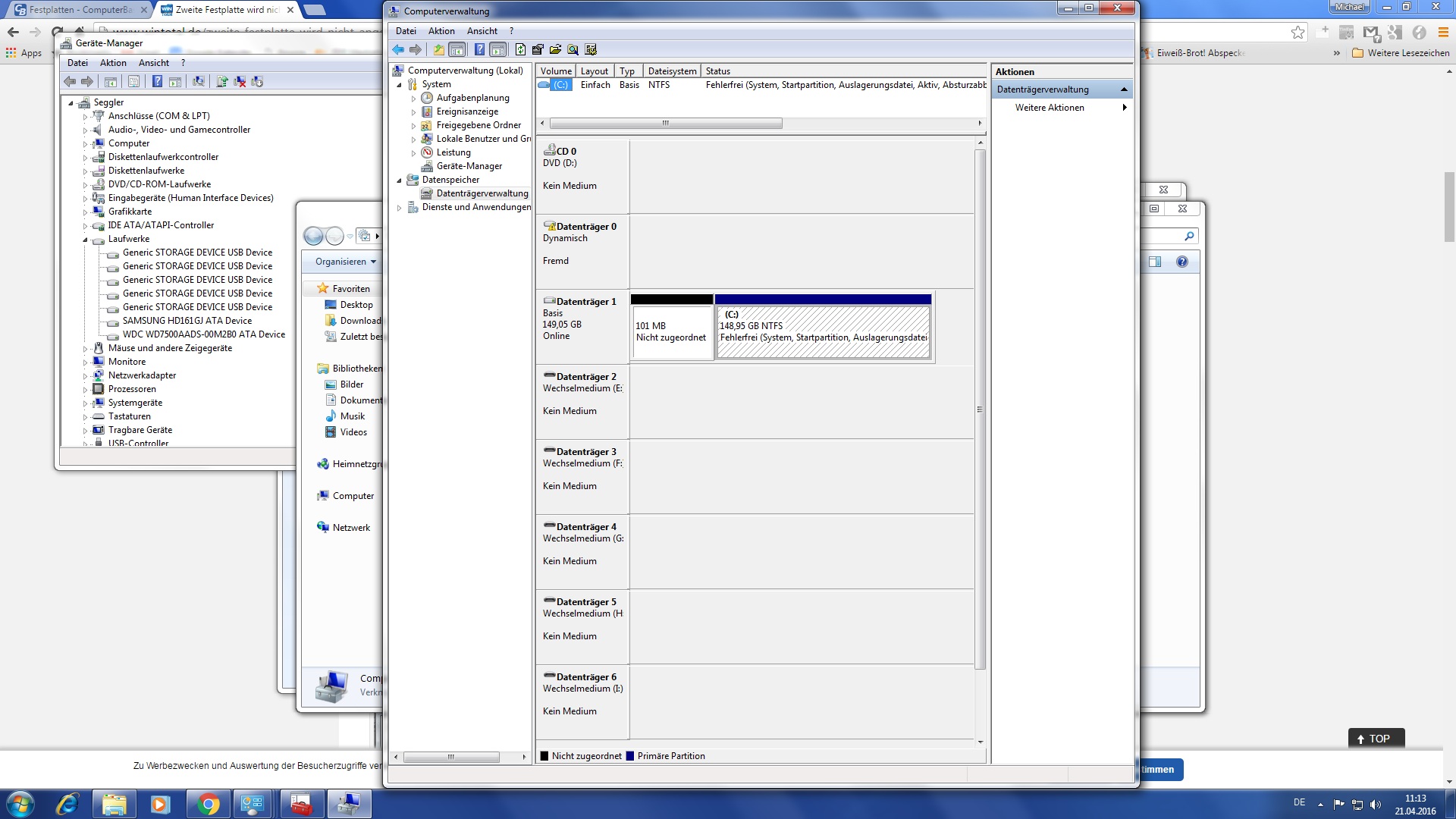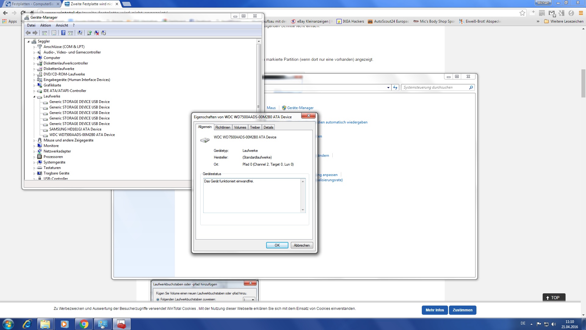 Ich hatte zusätzlich zur SSD eine 1 TB und eine 750 GB Platte als reine Datenspeicher verbaut. Diese habe ich zur Neuinstallation abgeklemmt und nach der Neuinstallation wieder angeschlossen. Die 1 TB Platte macht keinerlei Probleme, aber die WD mit 750 GB. Sie wird zwar im Gerätemanager erkannt und korrekt angezeigt. Aber sie erscheint nicht im Arbeitsplatz