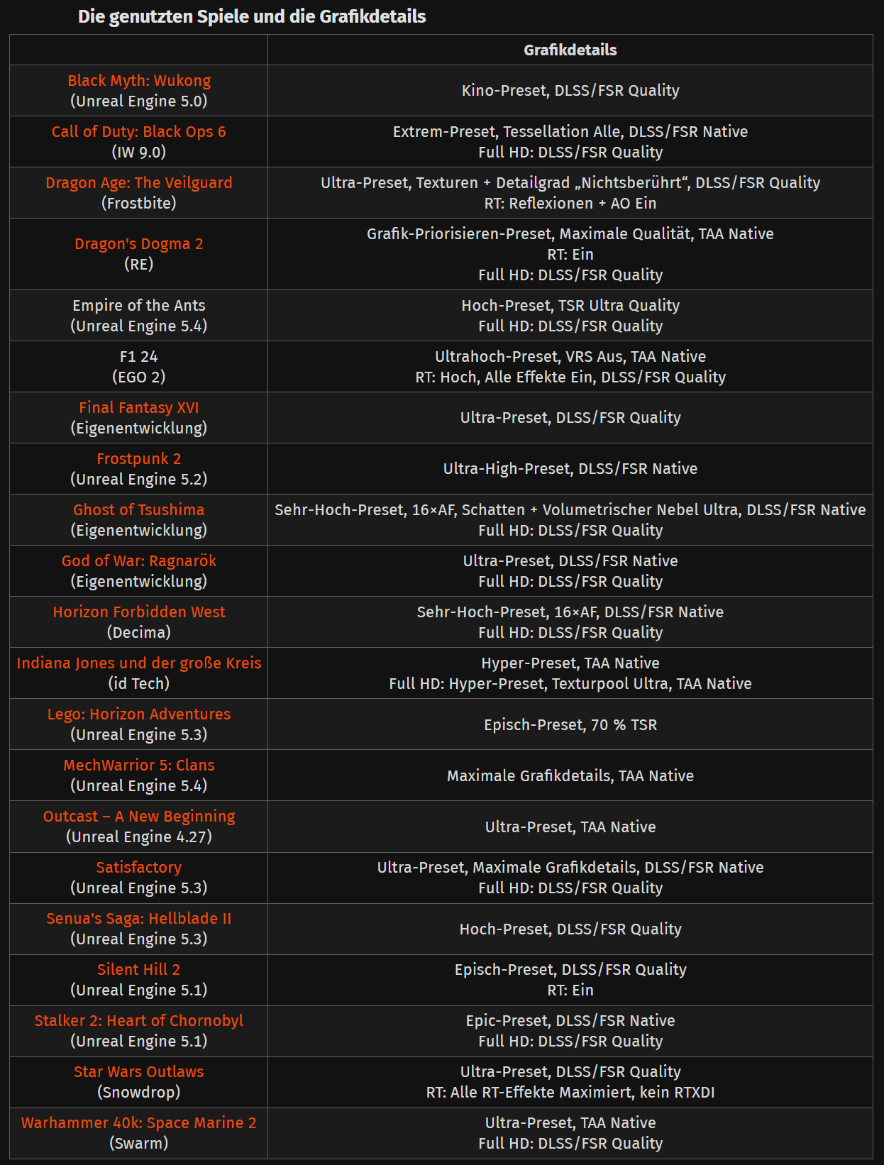 Um das ganze noch einmal zu verdeutlichen, folgt hier der Auszug aus euren aktuellen Benchmarkspielen und deren Grafiksettings, die ihr für die Vergleichbarkeit stets wählt: