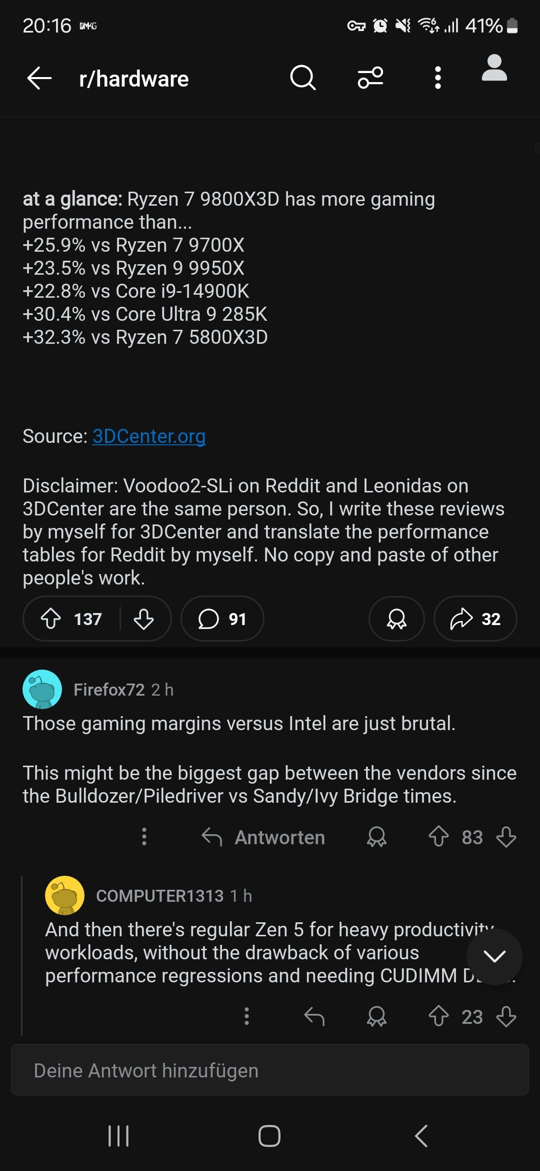 So ist es. Abgesehen von der natürlich brachialen Gamingleistung ist das der Grund, warum ich mein Intel-System nun ersetzen will. Die Anwendungsleistung des 7800X3D reichte mir bisher nicht aus, da ich meinen Rechner auch beruflich nutze(n muss).