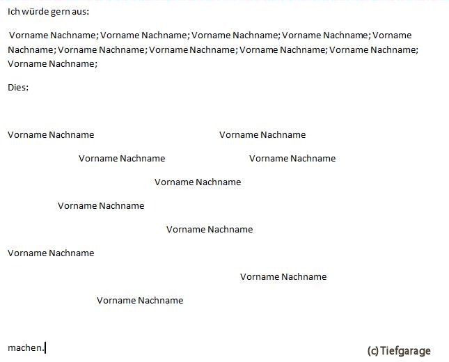 Ich habe ungefähr 80 Namen und würde die gerne bunt über ein Dokument verstreuen. Dabei sollte jeder Namen ganz lesbar sein. Anders ausgedrückt habe ich vor, eine Kette von Namen auf eine Fläche gleichmäßig verteilen.