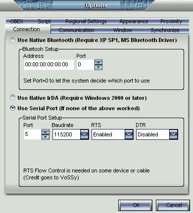 Zu beachten ist das man in den Optionen nicht Bluetooth als Verbindung wählen darf sondern über einen virtuellen COM Port gehen muss der ja von der Widcomm Software bereitgestellt wird (bei mir war es COM5), also erst über WIdcomm eine serielle Verbindung aufbauen und dann mit FMA über COMx connecten.