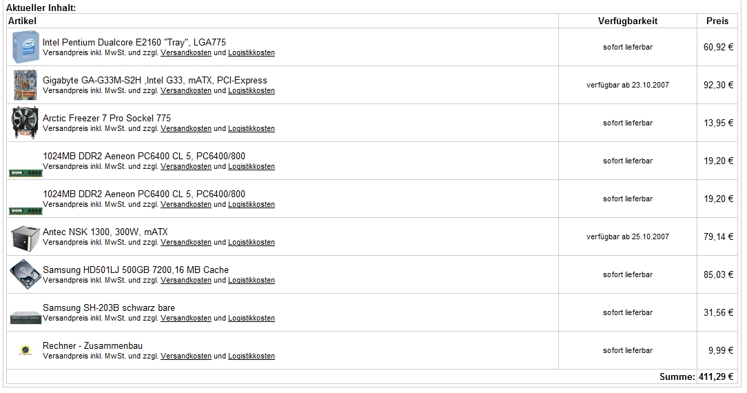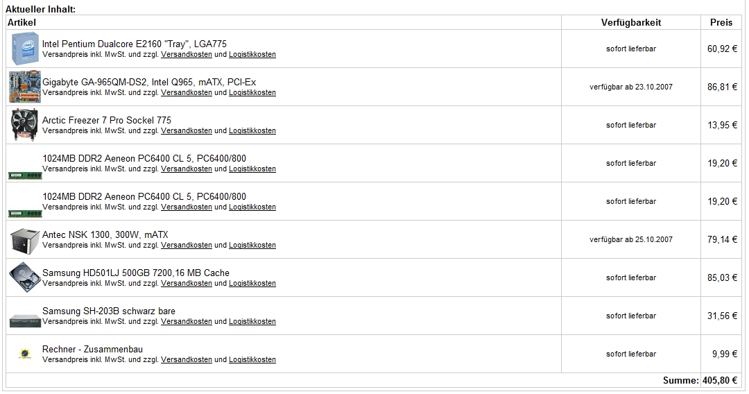 ich möchte heute meinen neuen HTPC bei hardwareversand.de bestellen. Ich habe vor zu übertakten (ca. 3 Ghz) und möchte später noch 2 Festplatten von der gleichen Sorte nachkaufen und diese dann zu dritt im Raid 5 schalten. Ist dies auf dem Mainboard und mit diesem Gehäuse möglich? Reichen 2 GB Ram für ein Raid 5 unter Vista aus? Was gibt der CPU-Kühler beim Übertakten her? Ist der Brenner in Ordnung? (nicht zu laut beim abspielen von DVD`s). Kann ich später noch eine Grafikkarte nachkaufen, wenn ja, wie groß darf diese maximal sein? Ist das Netzteil qualitativ in Ordnung, nicht zu laut?