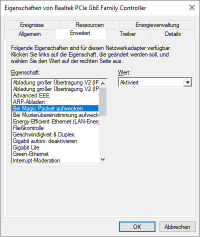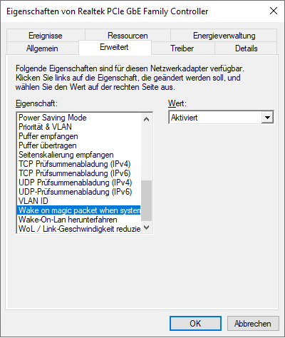 In den Eigenschaften zum Realtek LAN Anschluss habe ich WoL aktiviert.