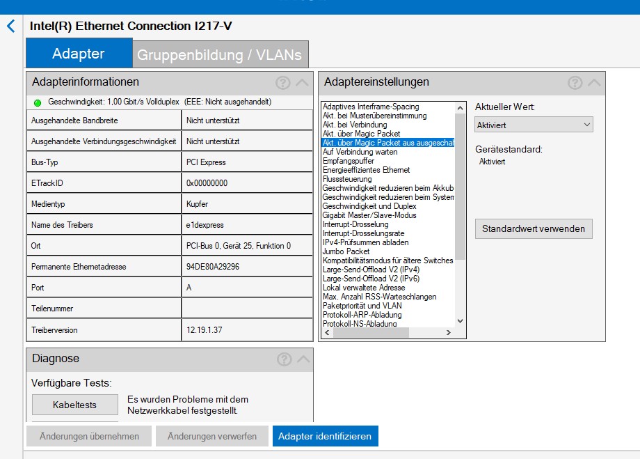 Von der Intelseite den Treiber für den 1219 Netzwerkadapter geladen und auch das ProSet installiert.