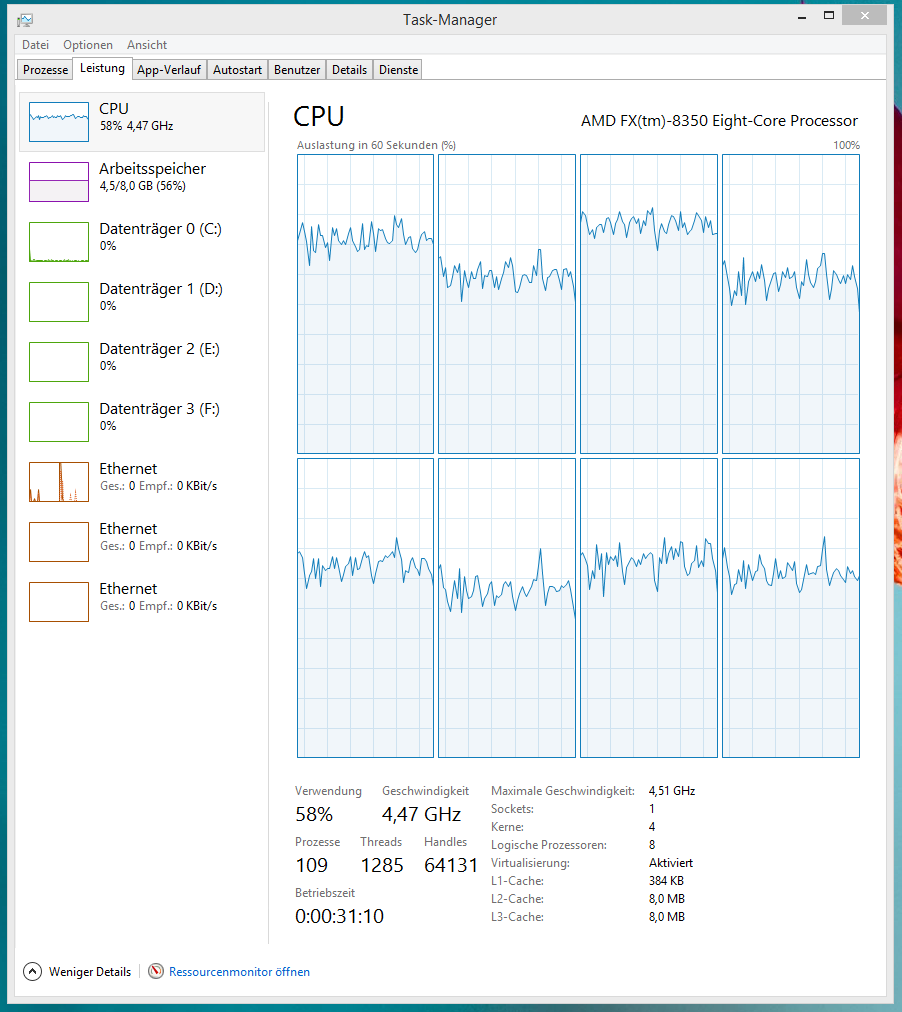 Normalerweise würde ich auf CPU Limit tippen, aber ich kann mir das hier nicht so recht vorstellen, da soweit mir bekannt das Spiel bzw. die Engine gut mit einem FX 8350 skaliert. Laut Taskmanager werden alle 8 Kerne auch sehr ausgeglichen belastet, auch ZU ausgeglichen um zu sagen das Windows hier gut verteilt.
