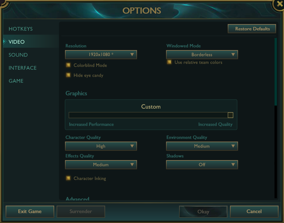 It is almost impossible to tell the difference between Very High and High shadows, yet lowering the shadows is one of the single-best steps to improving performance in LoL without really hurting the visuals (until you turn them off completely). The HUD Animations don't really add anything interesting to the visuals.