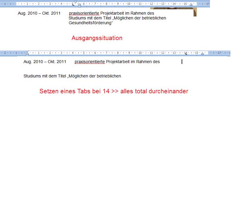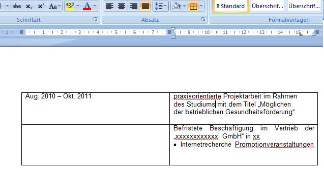 Angeblich soll das irgendwie per Tabstopps gehen, aber wenn ich den ganzen Text markiere und oben in der Leiste irgendwo hinklicke, wird der ganze Lebenslauf total verzerrt dargestellt.