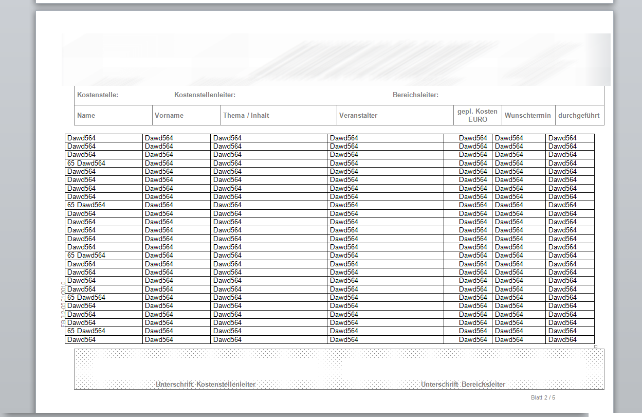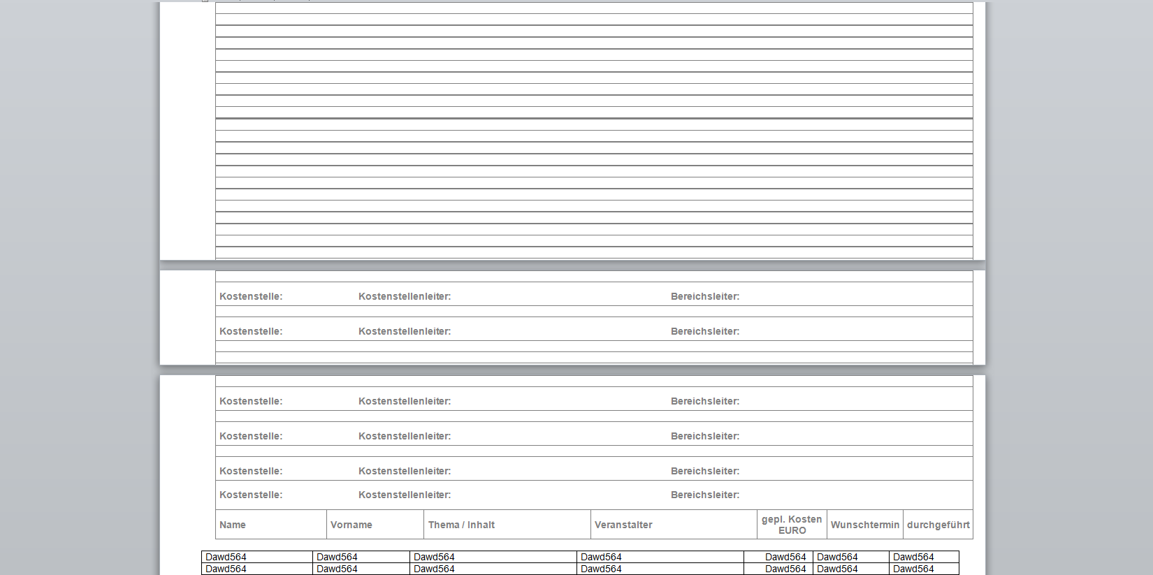 Ich habe ein Dokument (A4, Querformat). Das Dokument besteht aus Kopfzeile, Fußzeile und als Inhalt eine Tabelle.