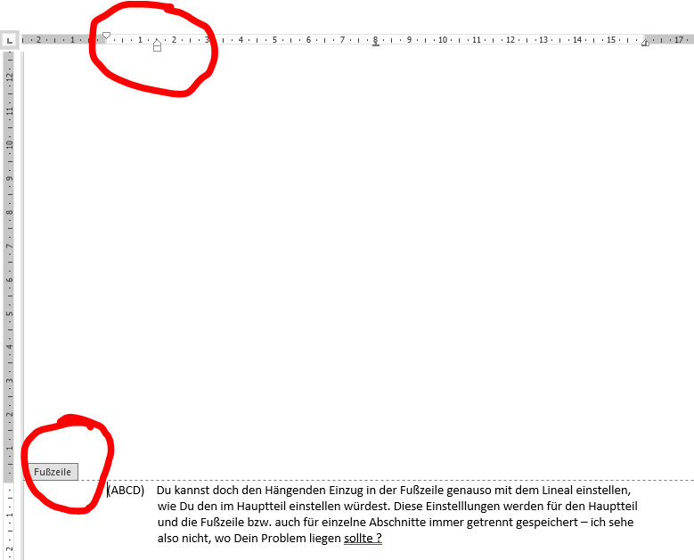 Ich habe mit diesem Linealwerkzeug versucht, die Zeilen zu verschieben. Klappt soweit, allerdings wird es problematisch, sobald die Fußnoten zwei- oder dreistellig werden. Dann beginnen die Zeilen nicht untereinander, sondern verschoben. Ich habe rausbekommen, dass man nach der Fußnotenziffer ein Tab einfügen kann.