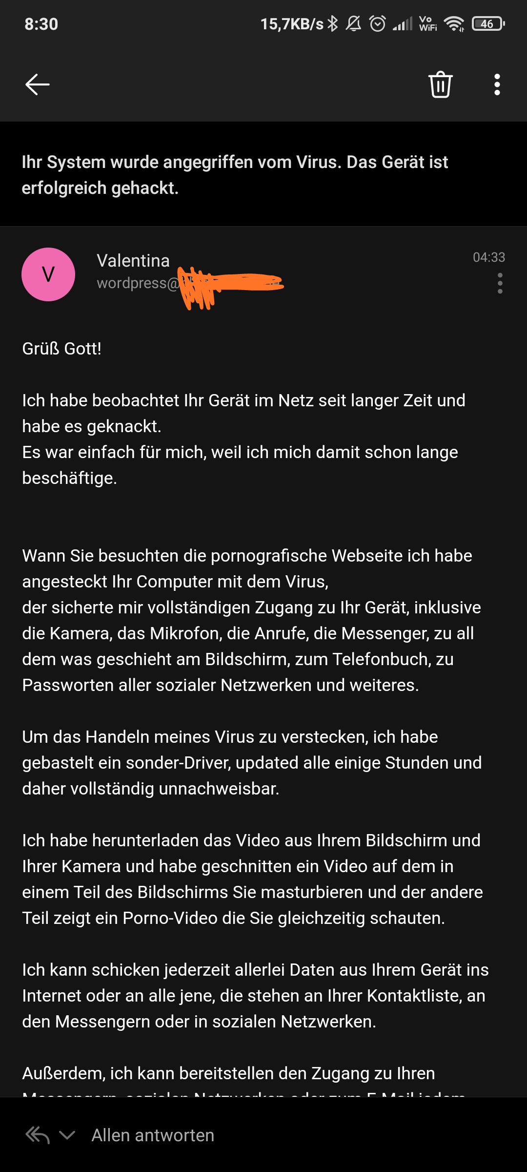 mir ist eben in meinem E-Mail Postfach aufgefallen, das ich eine Spam-Nachricht auf meine Wordpress-Adresse erhalten habe. Da ich für alles eine Catch-All nutze, ist das relativ einfach festzustellen. Diese Adresse habe ich noch nie woanders genutzt. Ist euch sowas auch schon aufgefallen? Es ist so eine Email die von mir Bitcoin verlangt, weil ich angeblich vor dem Rechner masturbiert hätte. Er hätte es aufgenommen. Wie er das angeblich gemacht hat, muss er mir Mal erklären. Bei einem Rechner ohne Webcam